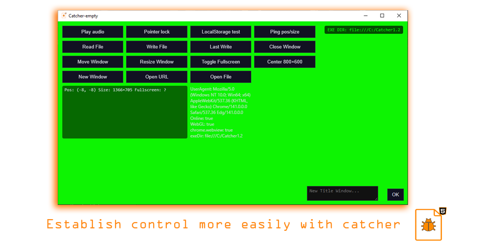 Catcheer is a free software created to play apps or games (more specialized in games) Based on html, catcher is a simple app that uses Embedded Webview2 to play your html files, catcher offers support for fluid webGL as well as GPU acceleration that improves the performance of your video games, also offers facilities for the customization of your product (customize icon, full screen, window mode, size or title) you can also use a variety of messages that allow and facilitate the interaction with some elements of the system such as reading or writing files, change or get position / size of window, run new html games based on the default path of execution of catcheer files and more, get catcheer completely free or its plugin for construct 2 and package your app / game in html with total freedom and very easily