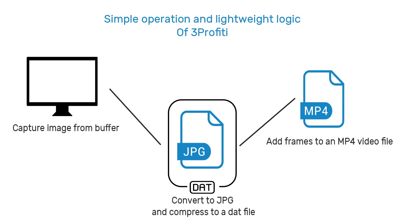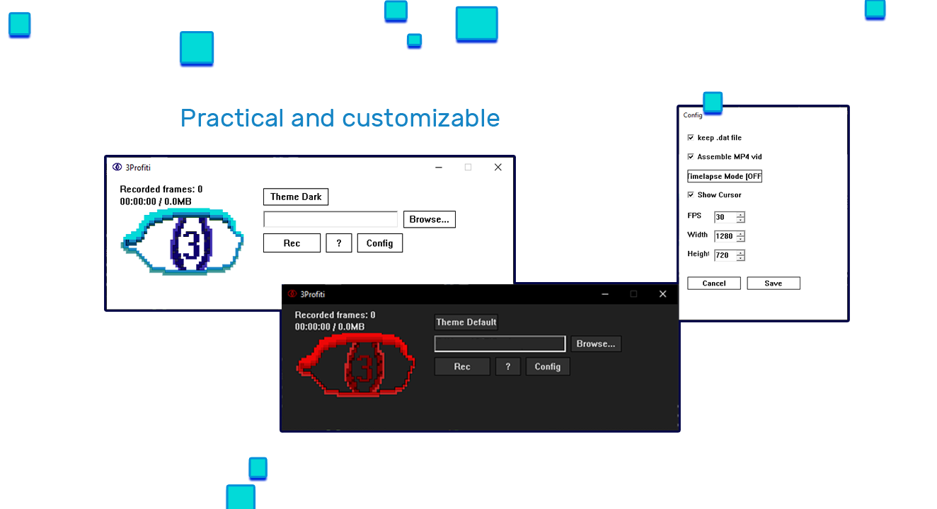 3Profiti is a lightweight and easy-to-use screen recorder designed to offer complete control without the hassle. It allows you to capture video with advanced options such as displaying or hiding the cursor, adjusting the frame rate, choosing the output resolution, and activating a timelapse mode. Its interface includes a direct recording button, a dark or light theme selector, and a simple configuration window. It also offers additional features such as a .dat file extractor and the ability to automatically assemble MP4 files. All this in a compact installer, designed for those looking for a practical, fast, and reliable tool for recording their screen.